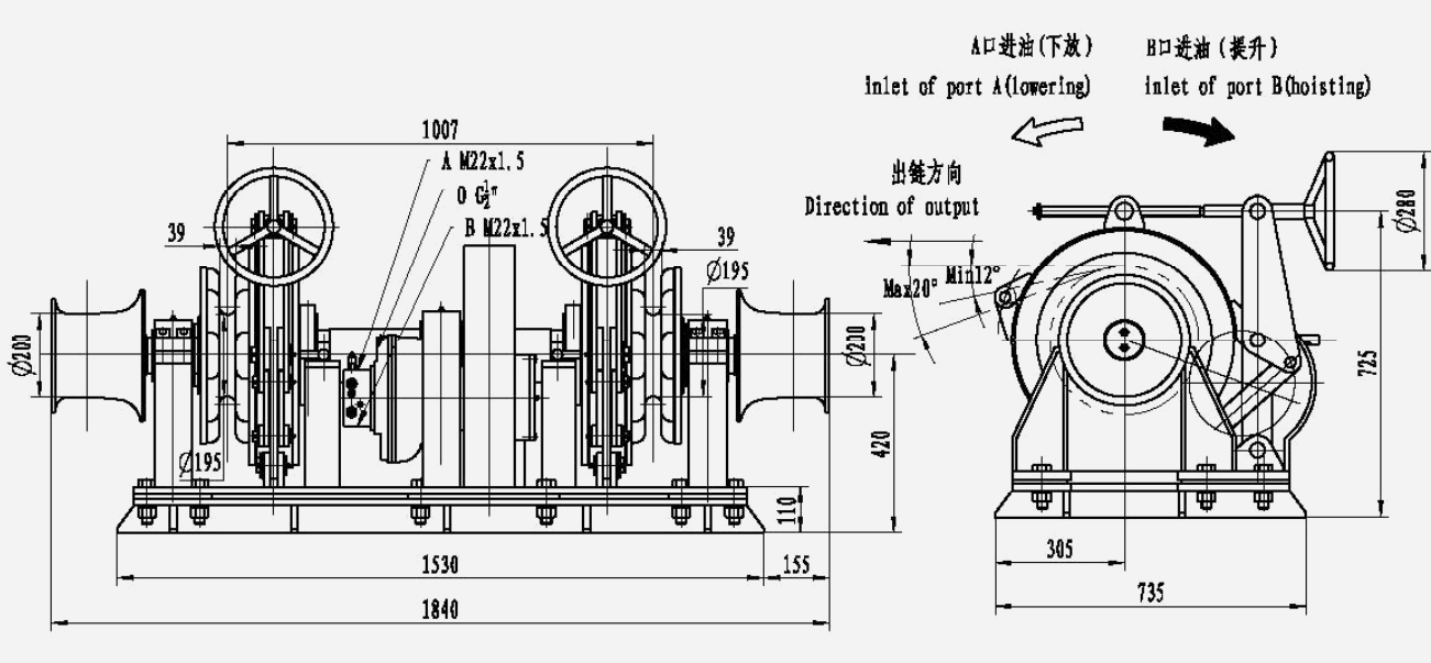 | Model | Werken laden (KN) | Overbelasting trekken (RN) | Vasthouden laden (KN) | Nominale snelheid van ankerlier (m/min) | Ankerplaats | Totaal verplaatsing (ml/r) | Beoordeeld Druk (ml/r) | Levering oi1 stroom (l/min) | Ketting diameter (mm) |